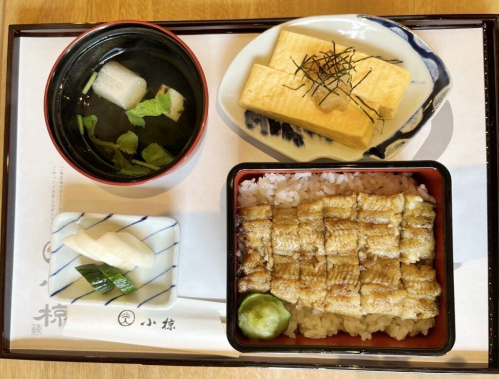 うなぎ小椋JR店限定メニュー。白焼き1/2本入り、だし巻き、香の物、お吸物